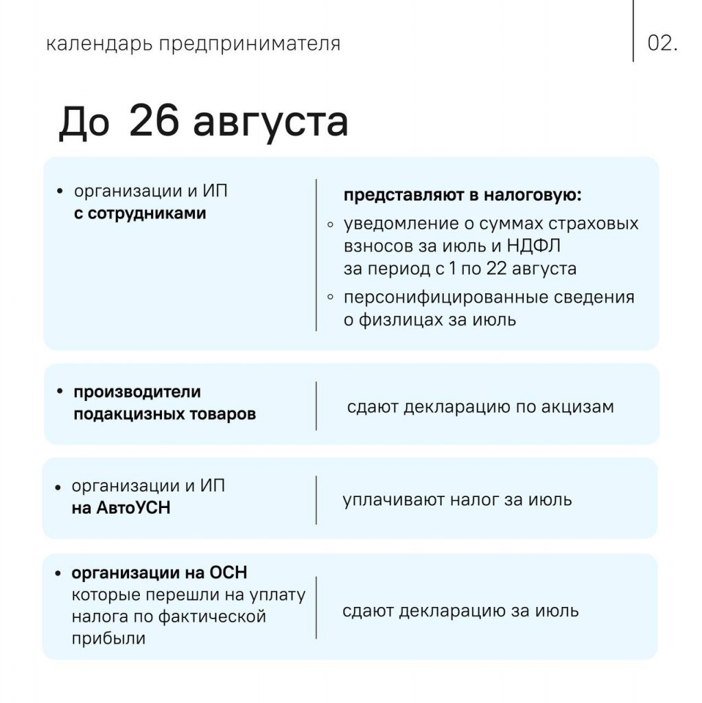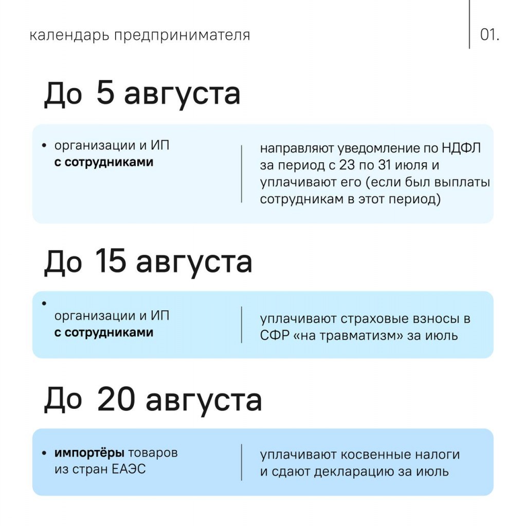 Последний месяц лета дает предпринимателю возможность немного отдохнуть и считается идеальным периодом для отпусков. В нём 31 день и обычная отчётность. Календарь предпринимателя от Корпорации МСП поможет не пропустить важные даты августа.