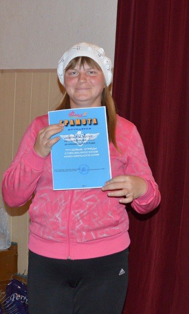 Настал самый приятный момент – вручение заслуженных наград, которые были приобретены за счет средств районной целевой программы «Молодежь Боготольского района» на 2012 – 2014 годы. Наградить лучших бойцов ТОС ведущие пригласили директора молодежного центра «ФАКЕЛ » Наталью Викторовну Прикатову. Она вручила грамоты и подарки лучшим бойцам ТОС по итогам сезона 2013 года: Виктории Сунхай, Екатерине Ледневой, Полине Рыжиковой, Никите Кудряшову, Виктору Гурьянову, Андрею Истомину, Ирине Кравченко, Александру Баркову, Анастасии Беляковой, Екатерине Кузнецовой. Право наградить лучших бригадиров и лучшие трудовые отряды старшеклассников Боготольского района, вручить грамоты и призы было предоставлено ведущему специалисту отдела культуры и молодежной политики Ольге Александровне Симон. Грамот и подарков были удостоены бригадиры ТОС Лунева Олеся (с. Юрьевка) и Маркова Галина (с. Красный Завод), а «Лучшим отрядом ТОС сезона 2013» стали отряды муниципального бюджетного учреждения культуры «Централизованная клубная система» с. Большая Косуль, отряд «МЧС» МБУК ЦКС с. Юрьевка и отряд «Отважные ребята » МБУК ЦКС с. Красный Завод. Также Ольга Александровна поблагодарила всех активистов ТОС и рассказала о предстоящих планах и условиях работы ТОС на следующий трудовой сезон.