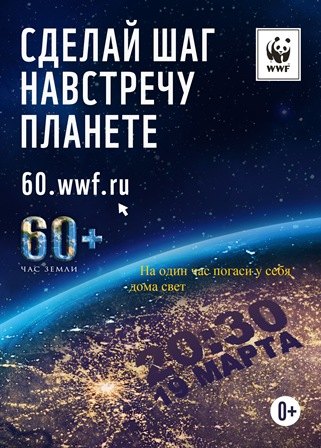 Сегодня Час Земли — это самая массовая экологическая акция на планете. В ней принимают участие более 2 млрд человек по всему миру, более 170 стран и около 7000 городов. Тема Часа Земли этого года в России — экологический след. Экослед — это площадь поверхности Земли, необходимая, чтобы обеспечивать нас ресурсами и поглощать отходы. Если бы все жили как россияне, человечеству было бы необходимо 2,5 планеты. В ходе подготовки к Часу Земли WWF России будет рассказывать о том, как каждый может сделать свои повседневные привычки более экологичными. Для этого предлагается руководствоваться советами в 7 основных сферах: еда, дом, транспорт и путешествия, покупки, переработка, вода и культура. ЧАС ЗЕМЛИ В РОССИИ Час Земли-2015: Как это было В Часе Земли, который проводится в России с 2009 года, принимают участие от 16 до 20 миллионов человек. В назначенное время гаснет подсветка архитектурного ансамбля Московского Кремля, Красной Площади, собора Василия Блаженного и ГУМа, а также более чем 100 других известных по всей стране московских зданий. Такой размах акции в столице возможен благодаря поддержке Администрации президента, Минприроды и департамента природопользования правительства Москвы. Активно подключаются к акции и другие регионы, а всего в акции участвуют более 120 городов России. WWF России в рамках акции традиционно просит своих сторонников поддержать одну из своих природоохранных инициатив: • В 2015 году более 80 тысяч человек выступили в поддержку обращения к президенту России с просьбой приостановить новые проекты по добыче нефти на арктическом шельфе. • В 2014 году более 115 тысяч человек поддержали проекты WWF России по охране редких видов животных, удалось собрать более 3,8 млн рублей. • В 2013 году было собрано 130 тысяч подписей за запрет промышленных рубок в защитных лесах, и сейчас соответствующий законопроект находится на согласовании в органах власти. • В 2012 году было собрано более 120 тысяч подписей за закон о защите морей от нефтяного загрязнения. Закон был подписан президентом и с 1 июля 2013 года вступил в силу. • Jimmy Bond ↑ © WWF Indonesia • Адриан Колотилин ↑ © WWF России ИСТОРИЯ ЧАСА ЗЕМЛИ Первый Час Земли организовал в 2007 году WWF Австралии. Акция имела огромный успех: в ней приняли участие более 2 млн человек. Уже на следующий год к Часу Земли присоединились 35 стран мира. В назначенное время погасла подсветка Колизея в Риме, моста Золотые ворота в Сан-Франциско и многих других достопримечательностей. Каждый год к Часу Земли присоединяются новые страны, и все больше людей своим участием в акции показывают неравнодушие к будущему планеты. В 2009 году WWF впервые официально провел акцию в России, однако и ранее в нашей стране ее поддерживал ряд энтузиастов. Уже в 2013 году к Часу Земли присоединились более 70 городов России. В Москве была выключена подсветка таких известных исторических зданий, как Московский Кремль, Храм Василия Блаженного, ГУМ и многих других. Час Земли ежегодно поддерживают сотни известных людей: общественных деятелей, актеров, музыкантов. В российской акции принимали участие телеведущие Николай Дроздов, Гарик Мартиросян, Михаил Галустян и Антон Комолов, лидер группы «Ночные Снайперы» Диана Арбенина, группа «Виагра» и многие другие. 19 марта в 20:30 на один час погаси у себя дома свет и выключи не жизненно важные электроприборы.