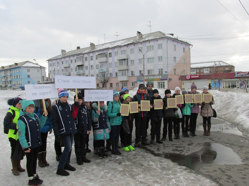 Акция проводилась в целях популяризации светоотражающих элементов среди пешеходов. Ребята совместно со своим руководителем А. Реутовым подготовили плакаты и таблички со светящимися буквами, из которых складывается слово «Засветись».
