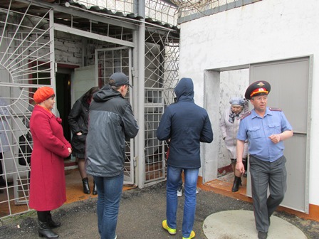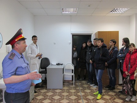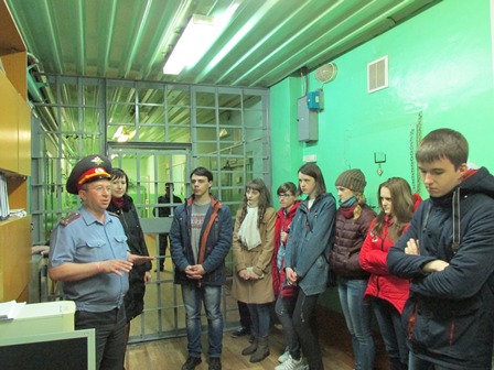В медицинском кабинете фельдшер В. Махнев рассказал, как он проводит осмотр граждан перед помещением их в изолятор. Школьники увидели в каких условиях содержаться административно задержанные, осмотрели прогулочный дворик, следственную комнату.