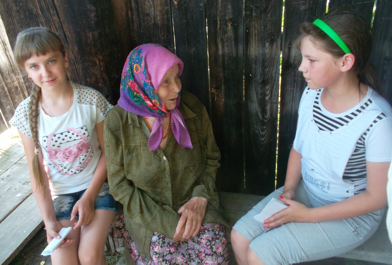 3 августа школьники встретились с Татьяной Григорьевной Ивановой, уроженкой деревни Кузюкино, которая сейчас проживает в деревне Ново-Петровка. Татьяне Григорьевне сейчас 84 года. Она охотно поделилась воспоминаниями о своём послевоенном детстве и молодости. Ребята узнали, что дети того времени в основном заканчивали 4 или 6 классов. Было и холодно и голодно, но всё же старались обучиться грамоте и счёту. Семья у них была многодетная – 6 детей. Дети помогали родителям по хозяйству. Великая Отечественная война коснулась и их семьи. Два брата воевали и вернулись с войны живыми.