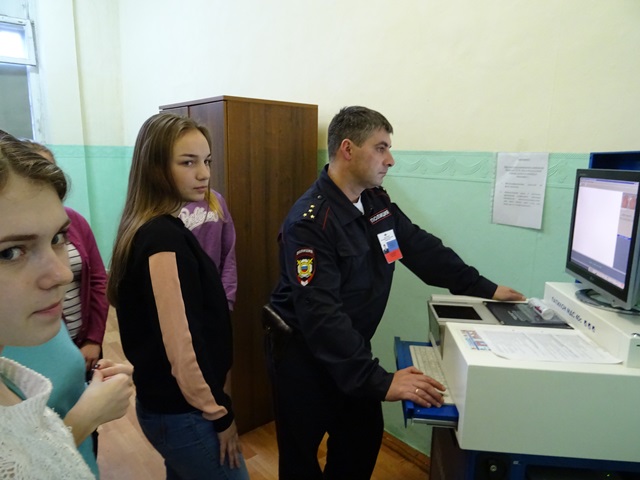 Самое интересное школьников ожидало в сердце любого подразделения органов внутренних дел - Дежурной части. Экскурсию провел капитан полиции Евгений Иванов – начальник смены дежурной части. Рассказав о теоретической составляющей своей службы, офицер перешел к практической. Вместе с сотрудниками полиции гости проверили работу Многофункционального дактилоскопического комплекса, данный аппарат вызвал неподдельный интерес ребят. Кроме того, для учащихся был проведен краткий обзор оружия и специальных средств, состоящих на вооружении стражей порядка.