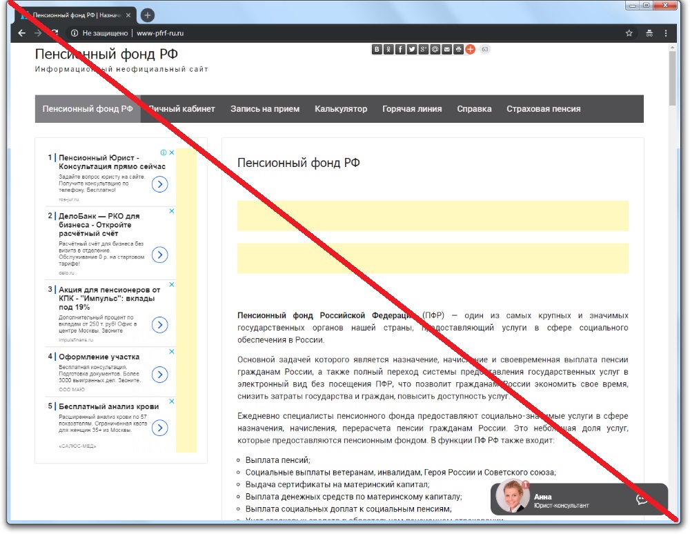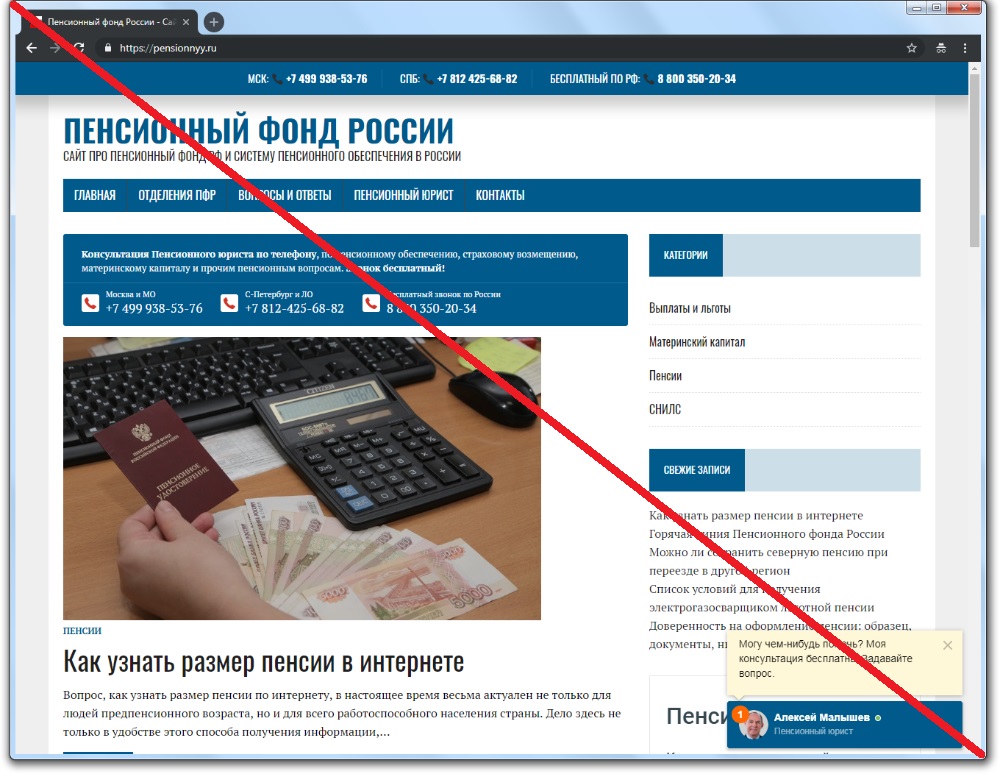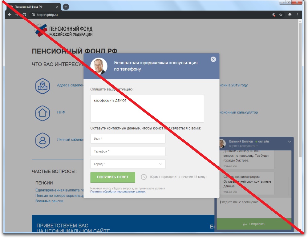 Все это тем не менее лишь служит прикрытием сомнительных сервисов, предоставляемых через такие ресурсы. Плохо структурированная организация сайтов-подделок и наличие большого количества рекламных баннеров сильно осложняет восприятие информации. Делается это умышленно, поскольку на помощь растерявшемуся в информационном хаосе пользователю всегда приходит онлайн-чат с «пенсионным юристом», предлагающим разобраться со всеми вопросами. Переписка при этом длится недолго и для решения проблемы человеку практически сразу предлагается оставить контактный номер телефона. Через некоторое время на него поступает звонок с предложением обратиться в «правовой центр поддержки», где человеку обещают помочь с оформлением причитающихся выплат. Такая помощь, само собой, небесплатна, но об этом потенциальная жертва «пенсионных юристов» узнаёт потом, равно как и о том, что обещанных выплат в действительности не существует.