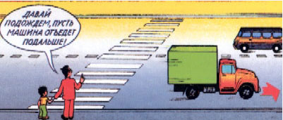 Весьма обманчивым может быть и автомобиль, движущийся на небольшой скорости. «Машина едет медленно, успею перебежать», - думает ребенок – и попадает под колеса. Во-первых, дети еще зачастую не могут правильно определить ни скорость автомобиля, ни расстояние до него. А во-вторых – медленно движущаяся машина может скры¬вать за собой другую, идущую на большой скорости, о чем ребенок даже не подозревает. Выход из этой «дорожной ловушки» - даже если машина приближается на небольшой скорости, ее все равно необходимо пропустить и обязательно убедиться, что за ней нет других автомобилей.