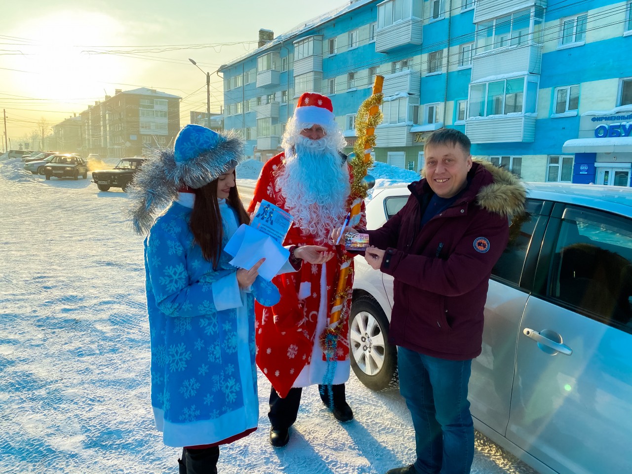 Полицейский Дед Мороз вместе со Снегурочкой вручили автолюбителям и прохожим приятные памятные призы и напомнили о соблюдении правил дорожного движения.
