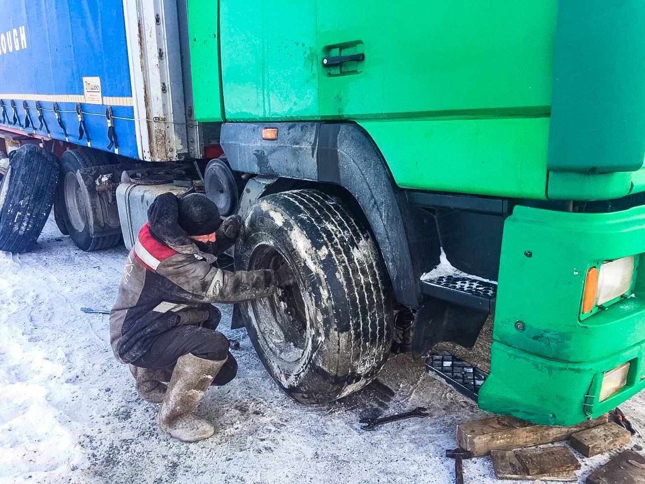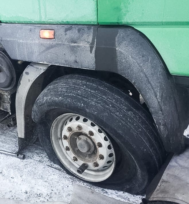 Сотрудники полиции помогли дальнобойщику заменить колесо, попросив подходящий домкрат у одного из проезжавших мимо автомобилистов.