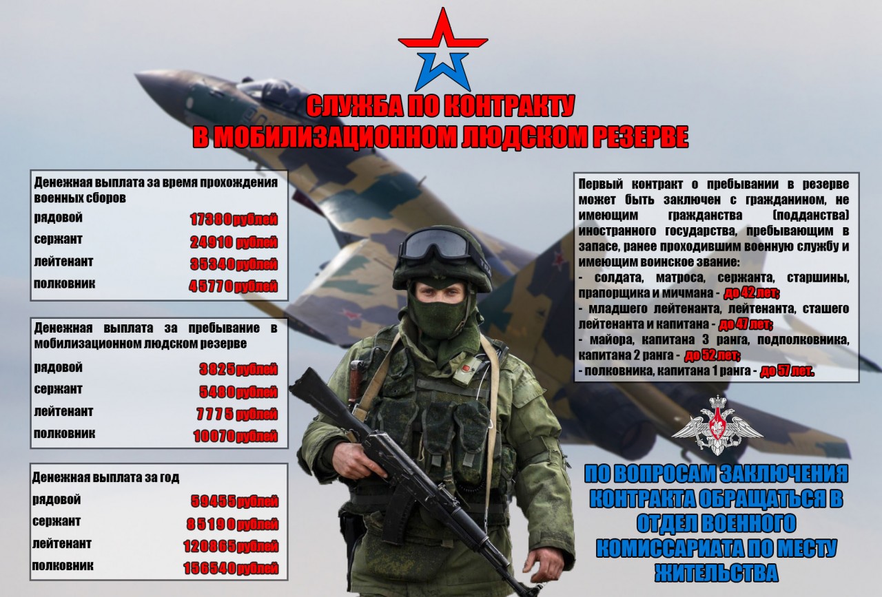 на меньший срок – до наступления предельного возраста пребывания в запасе. В контракте закрепляется добровольное поступление гражданина в резерв, а также срок и условия его пребывания в резерве. Резервистам осуществляются разовая денежная выплата в размере 1 мес. оклада (при 3-х летнем контракте) и 1,5 мес. оклада (при 5-и летнем контракте), а также ежемесячные % надбавки за срок пребывания в мобилизационном резерве.