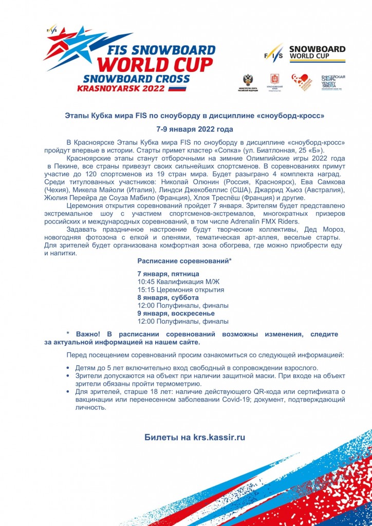 С 7 по 9 января 2022 года в Красноярске впервые пройдут этапы Кубка мира по сноуборд-кроссу. Более 120 спортсменов из 19 стран будут бороться за медали и за право поехать на Олимпиаду в Пекин. Среди титулованных участников: Николай Олюнин (Россия, Красноярск), Ева Самкова (Чехия), Микела Майоли (Италия), Линдси Джекобеллис (США), Джаррид Хьюз (Австралия), Жюлия Перейра де Соуза Мабило (Франция), Хлоя Треспёш (Франция) и другие.