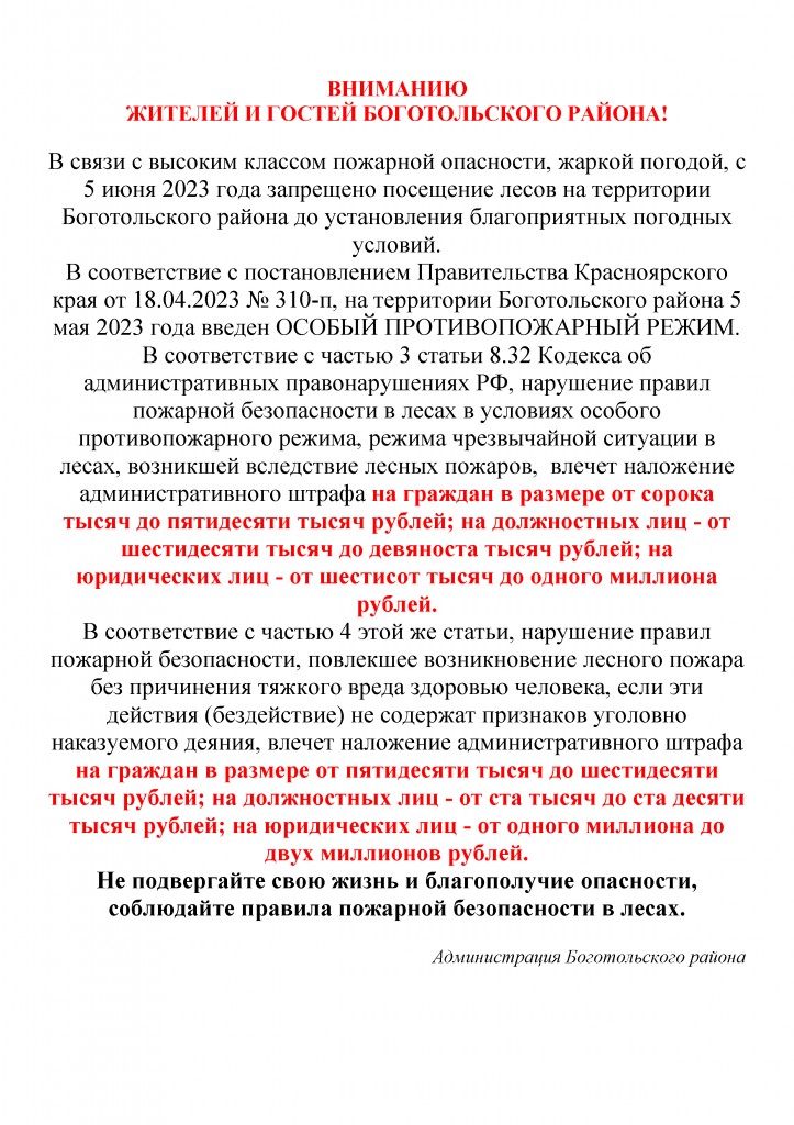 В связи с высоким классом пожарной опасности, жаркой погодой, с 5 июня 2023 года ЗАПРЕЩЕНО посещение лесов на территории Боготольского района до установления благоприятных погодных условий