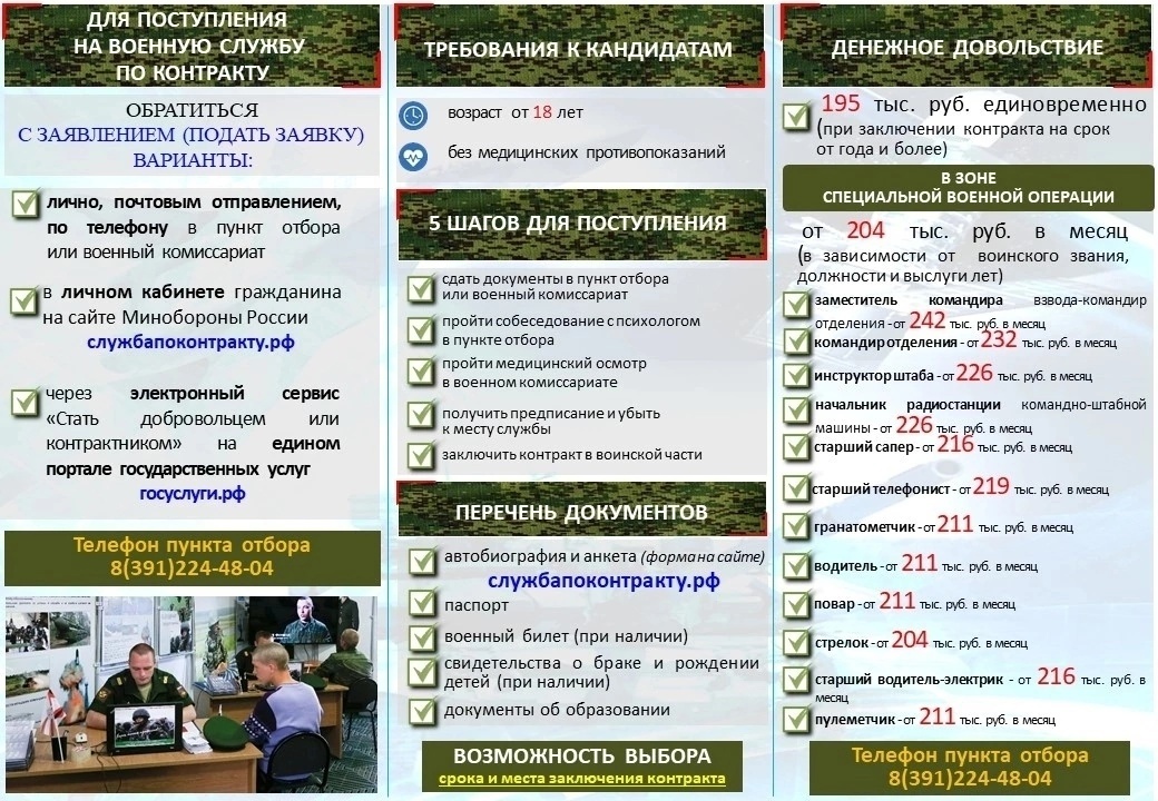 Во исполнение поручения Президента Российской Федерации от 14.02.2023 № ПР-309 по доукомплектованию войск (сил) личным составом в 2023 году, проводится набор граждан от 20 до 59 лет на контрактную службу в Вооруженные силы Российской Федерации, в основном, для участия в СВО. Призыв регулируется Федеральным законом № 53-ФЗ «О воинской обязанности и военной службе». По всем интересующим вопросам можно обратиться в администрацию Боготольского района по адресу: Комсомольская , 2, каб 33, т.8(39157)2-39-37 или в Военный комиссариат города Боготола, Боготольского района и Тюхтетского муниципального округа по адресу: ул. Советская, д. 62