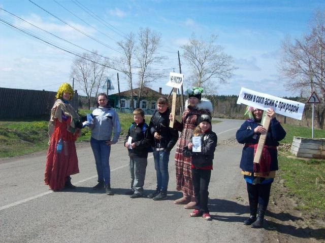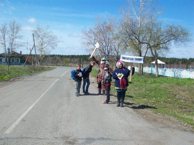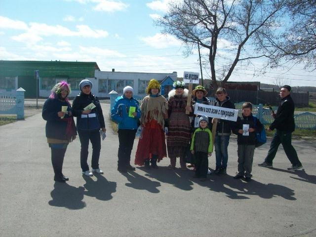Героями субботника были Лесовик (Иванова Н.), Кикимора (Рыжикова Е.) и Матушка-Природа (Кидяева О.). Артисты маршировали с призывами о наведении и сохранности порядка на улицах, в их исполнении звучали песни. Каждый свободен в выборе: взяться за грабли и поучаствовать в уборке территории или хотя бы не мусорить на улицах родного села, сделать село чище своими руками или продолжать ворчать по поводу окружающей грязи. Всем прохожим вручали буклеты о бережном отношении к окружающей среде « Береги Родную Природу».