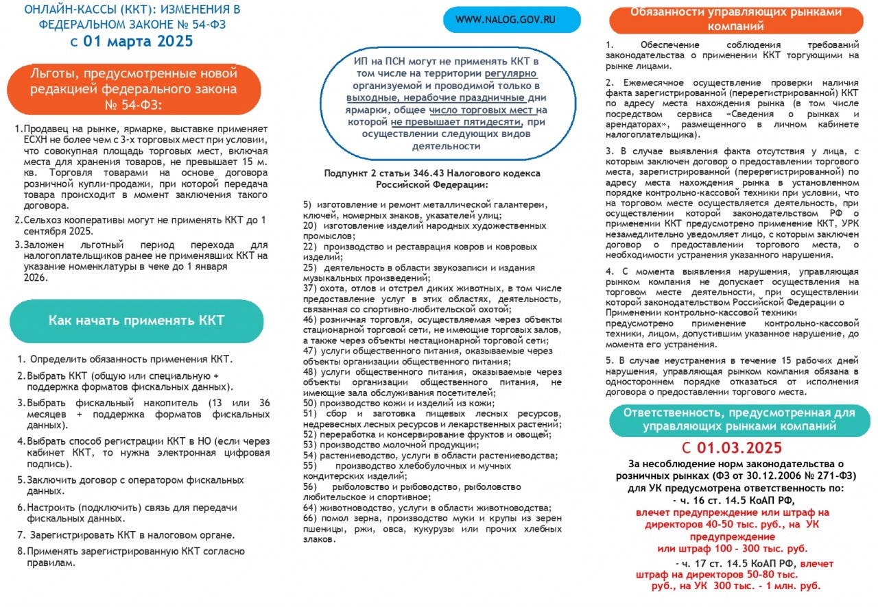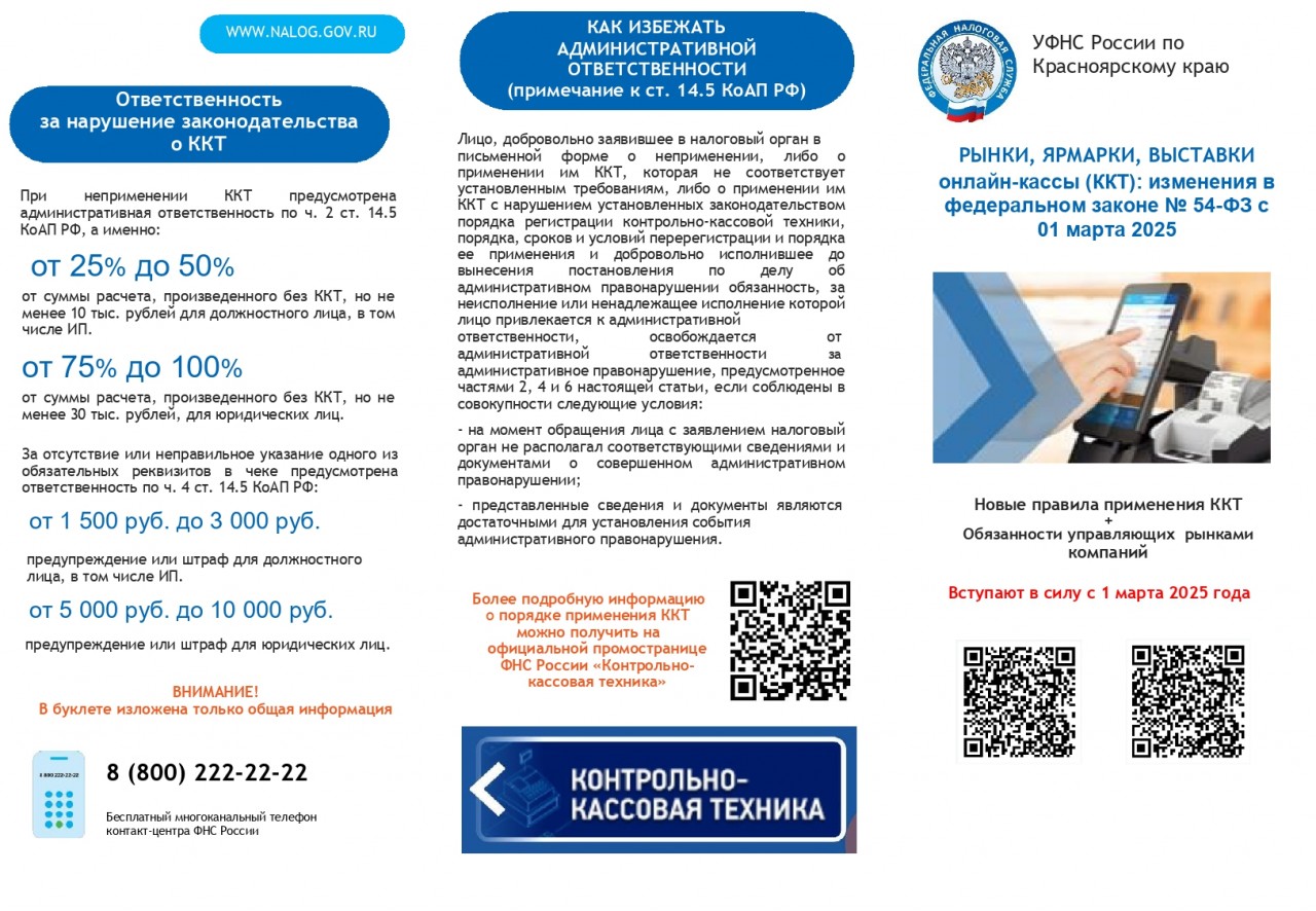 Межрайонная ИФНС России № 17 по Красноярскому краю сообщает, что в связи с принятием Федерального закона от 08.08.2024 № 273-ФЗ «О внесении изменений в статью 2 Федерального закона «О применении контрольно-кассовой техники (далее - ККТ) при осуществлении расчетов в Российской Федерации» и Федеральный закон «О розничных рынках и о внесении изменений в Трудовой кодекс Российской Федерации» (далее – Федеральный закон № 273-ФЗ) с 01.03.2025 наступает обязанность:
